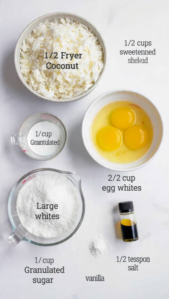 - Combine Ingredients: In a mixing bowl whisk egg whites until slightly frothy. Stir in granulated sugar, vanilla extract, and salt. Fold in shredded coconut until evenly coated.