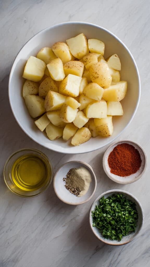 - Combine Ingredients: In a large bowl, toss the potato chunks with olive oil, garlic powder, paprika, salt, and black pepper until evenly coated.
