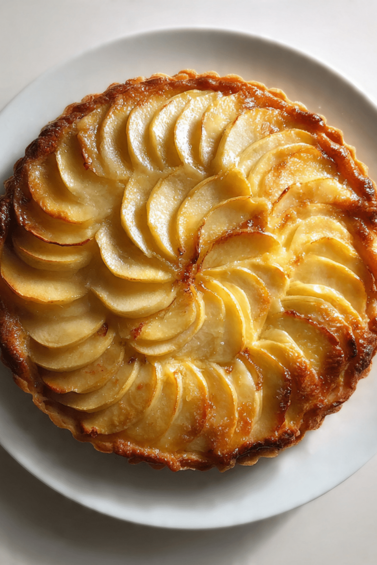 This classic apple tart features thinly sliced apples arranged in a beautiful spiral over a buttery, flaky crust and finished with a glossy apricot glaze. It’s the perfect dessert for any occasion, blending simplicity and elegance in every bite.