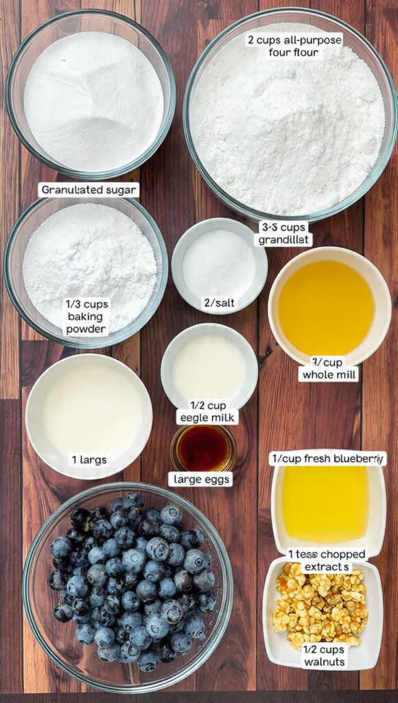 2. Combine Ingredients: In a large bowl, whisk together flour, sugar, baking powder, and salt. In another bowl, whisk eggs, milk, oil, and vanilla until smooth. Pour the wet mixture into the dry ingredients and stir gently until just combined. Fold in blueberries and walnuts carefully.