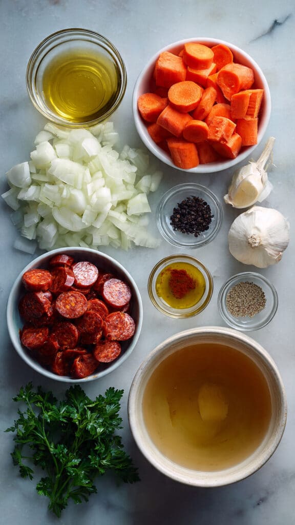 This soup is one of those dishes that surprises you. At first glance it seems humble, just carrots and sausage, but once you take a spoonful, everything changes. The carrots bring a natural sweetness that balances the smoky, slightly spicy chorizo. The broth becomes silky and rich without feeling heavy.