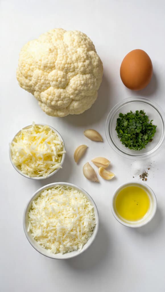 - Cauliflower: 1 large head, riced, forms the base of the bread.