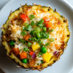 A sweet and savory baked rice dish loaded with juicy pineapple chunks, colorful vegetables, and gooey melted cheese, finished with a lightly golden top for the perfect balance of comfort and tropical flavor.