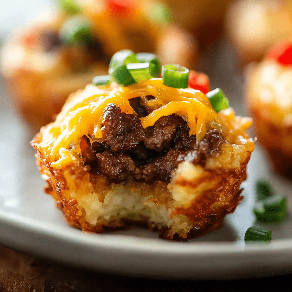 - Assemble the Dish: Spoon the beef mixture evenly into each tater tot cup. Sprinkle shredded cheddar on top.