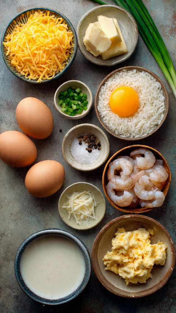 A comforting bowl of fluffy jasmine rice topped with creamy cheesy scrambled eggs and juicy sautéed prawns. This quick and satisfying dish comes together in just 20 minutes and delivers rich flavor, soft texture, and a touch of seafood sweetness in every bite.
