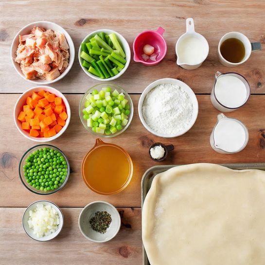 In a skillet, melt the butter over medium heat. Sauté onions, garlic, carrots, and celery until soft (about 5–7 minutes). Stir in the flour and cook for 2 minutes. Gradually add the broth and milk, stirring constantly until smooth and thickened. Add chicken, peas, thyme, salt, and pepper. Simmer for 3 minutes, then remove from heat. - Prepare Your Cooking Vessel: