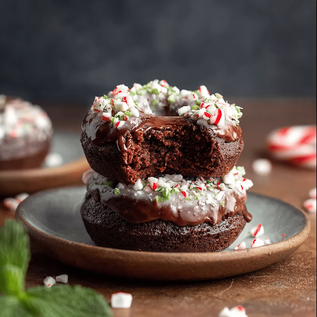 Soft, baked chocolate donuts glazed with a silky powdered-sugar peppermint glaze and finished with crunchy crushed peppermint candies, perfect for holiday breakfasts or festive treats.