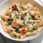 Creamy pasta dishes have roots in Italian inspired cooking, where simple ingredients like cheese, cream, and pasta come together in beautiful harmony. Over time, home cooks everywhere started adding proteins and vegetables to make it a complete meal in one bowl. Chicken and peas became a natural pairing because they complement creamy sauces so well. The sweetness of peas cuts through the richness, while chicken makes it hearty and filling. It is a modern comfort classic that feels both timeless and practical.
