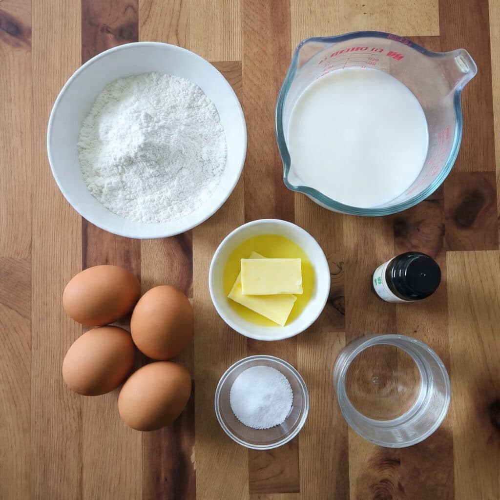 - In a blender or large bowl, combine flour, milk, eggs, melted butter, salt, vanilla (if using), and water. Blend or whisk until smooth. Let the batter rest for 30 minutes.