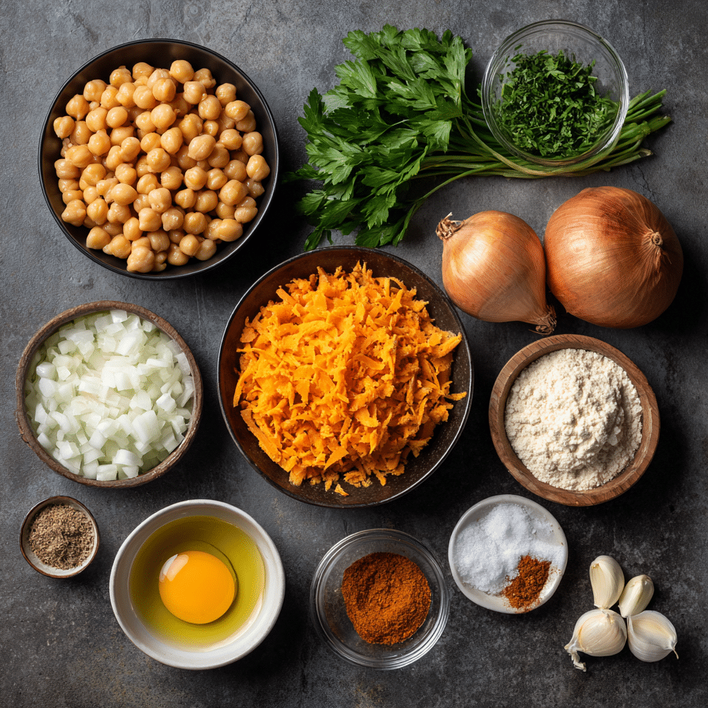 This dish was inspired by the idea of combining pantry-friendly staples with wholesome root vegetables to create something both nourishing and indulgent. Growing up, fritters were always that weekend treat—crispy edges, soft centers, and a flavor that lingered long after the plate was empty. By adding sweet potato to the mix, these fritters carry a subtle natural sweetness that balances beautifully with the earthy chickpeas.