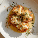 A Southern-inspired dish featuring crispy fried green tomatoes, topped with a creamy crab salad and drizzled with a zesty hot butter sauce. Perfect as a brunch centerpiece or an impressive appetizer.