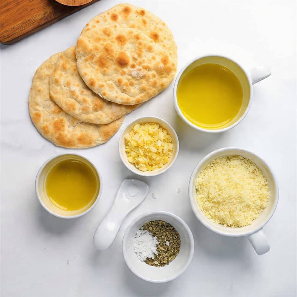 Pita bread has roots that stretch across the Middle East and the Mediterranean, and has been a staple for centuries. Its pocketed shape makes it perfect for stuffing, dipping, or crisping up like we do here. Toasting pita into chips or crisps is common in dishes like Fattoush, a Levantine salad that uses toasted or fried pita. Turning pita into garlic toast is a modern twist, combining the traditional bread with the universal love for garlic toast.