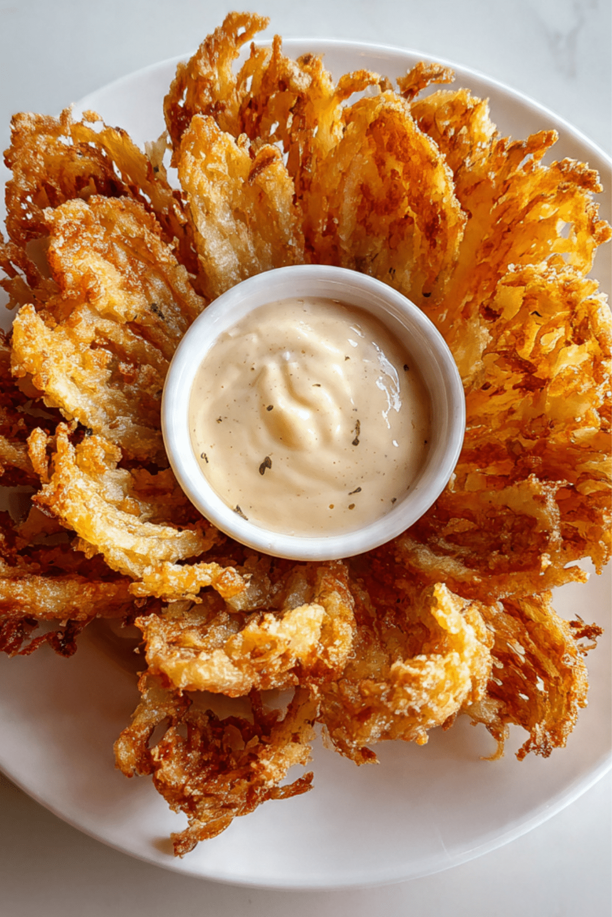 Serve your blooming onion on a rustic wooden board or a cast iron skillet for dramatic flair. Add a ramekin of bright orange dipping sauce to the middle. Sprinkle with green herbs or scallions for color contrast. Keep the lighting warm to show off the golden crust.