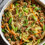 A quick and flavorful one-pan meal packed with seasoned ground chicken, tender cabbage, sweet carrots, and savory sesame soy sauce, inspired by classic egg roll flavors without the wrapper.