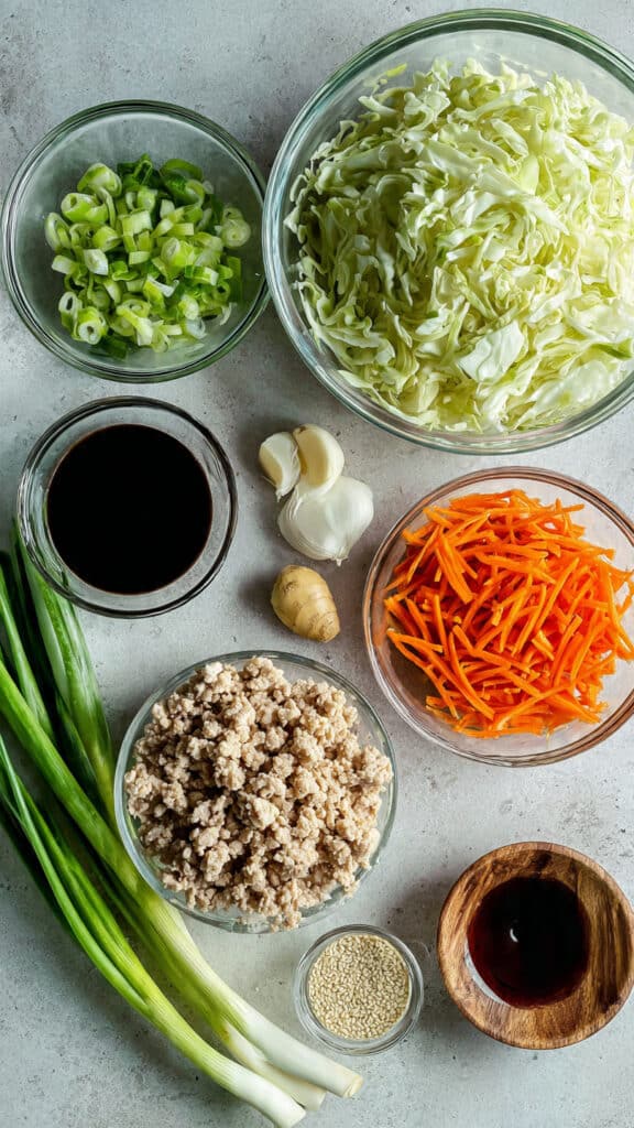 Keywords: egg roll bowl, ground chicken bowl, low carb dinner, quick weeknight meal, one pan meal