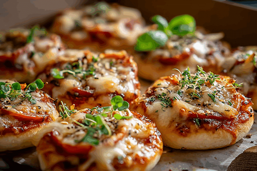These mini pizzas have crispy edges with soft, chewy centers. The cheese melts into a creamy layer over the tangy tomato sauce, while herbs bring a burst of freshness. Every bite balances crunch, melt, and savory delight.