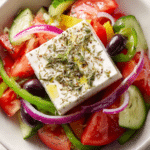Use a wide white bowl to highlight colors. Place feta neatly in the center and sprinkle oregano only on top for contrast. A final drizzle of olive oil creates a soft shine that makes it look irresistible.