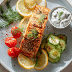A fresh and flavorful Greek-inspired salmon dish with lemon, dill, and a side of creamy tzatziki, perfect for a quick Mediterranean meal.