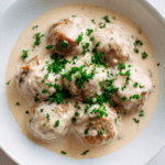 There is something deeply comforting about a plate of tender meatballs simmered in a silky cream sauce. The aroma alone, rich with garlic, herbs, and warm spices, fills the kitchen in the most inviting way. The sauce bubbles gently, coating each meatball in velvety goodness, and trust me, you’re going to love this. It is cozy, satisfying, and just elegant enough to feel a little special without being complicated. Let me tell you, it’s worth every bite.