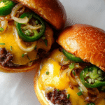 Juicy, crispy-edged smash burgers topped with caramelized onions and jalapeños, melted cheddar, and sandwiched in toasted buns — a spicy, savory explosion in every bite.