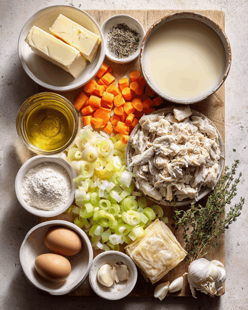 - Combine Ingredients: In a saucepan, melt butter, add garlic, leeks, and carrots, and cook until soft. Stir in the flour, then gradually whisk in chicken stock and cream to form a smooth sauce. Add chicken and thyme, season well.