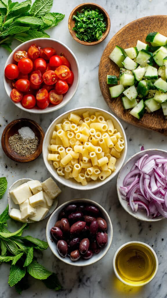 - Cook to Perfection: In a large bowl, combine pasta, tomatoes, cucumber, red onion, olives, parsley, and mint.