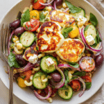 This style of pasta salad pulls inspiration from classic Mediterranean flavors where simple ingredients shine when treated with care. Olive oil, lemon, herbs, and briny olives are staples across coastal kitchens, often paired with grains or pasta for easy meals. Halloumi, known for its ability to hold its shape when cooked, adds a satisfying protein element that feels both traditional and modern in this context.