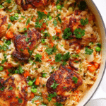 A comforting and flavorful one pot chicken and rice dish made with tender chicken thighs, fluffy long grain rice, vegetables, and warm spices. Perfect for an easy family dinner with minimal cleanup.