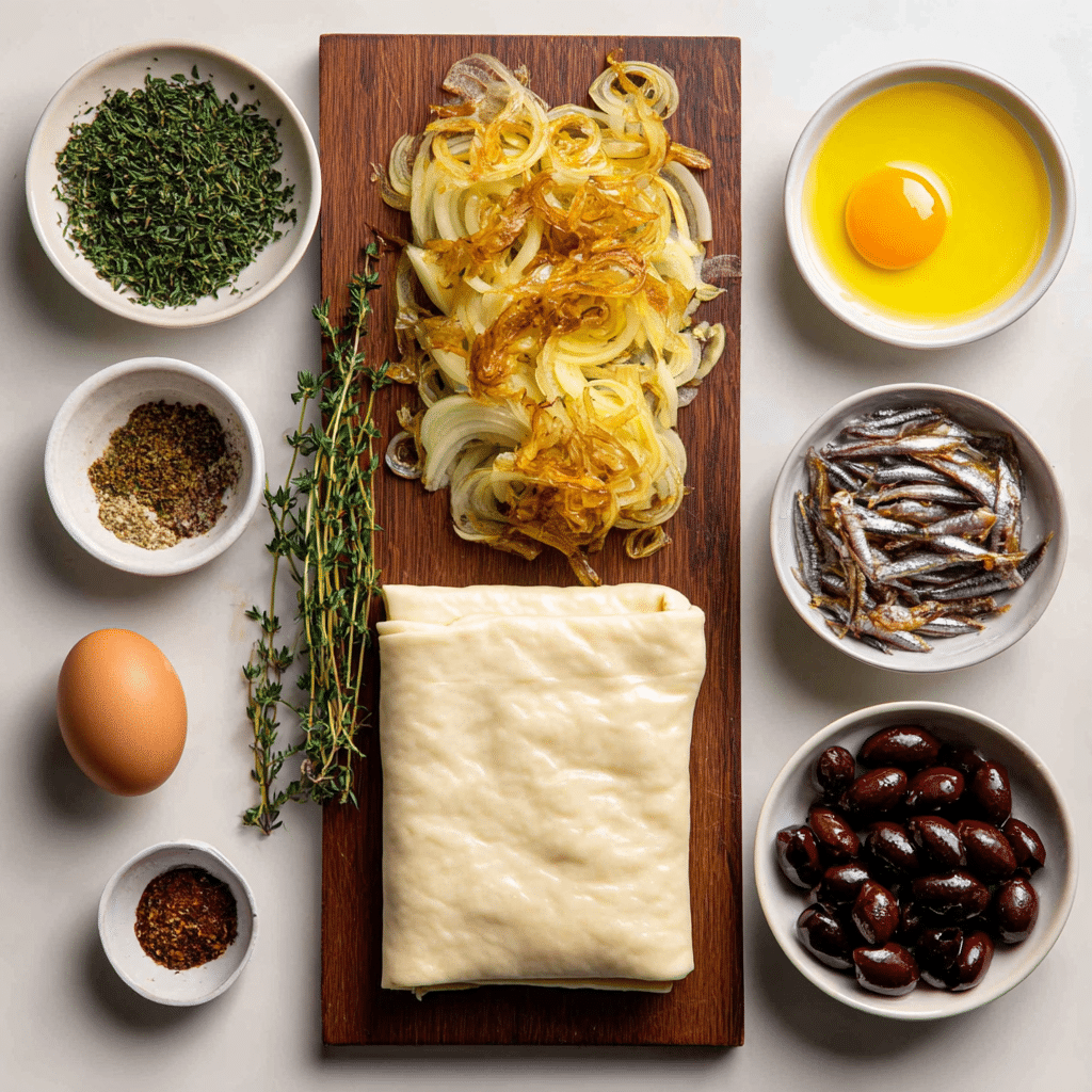 - Combine Ingredients: In a skillet, heat olive oil over medium heat. Add the onions and cook slowly for about 25–30 minutes until soft and golden. Stir in thyme, chopped anchovies, olives, and a pinch of salt and pepper. Let cool.
