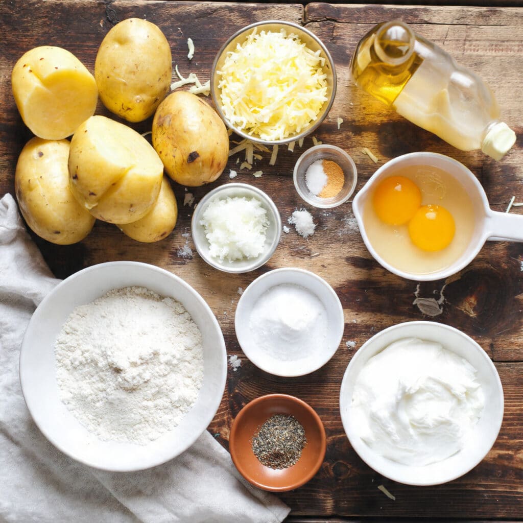 - Russet Potatoes: 2 pounds, peeled and grated – The main star, they provide starch and structure.