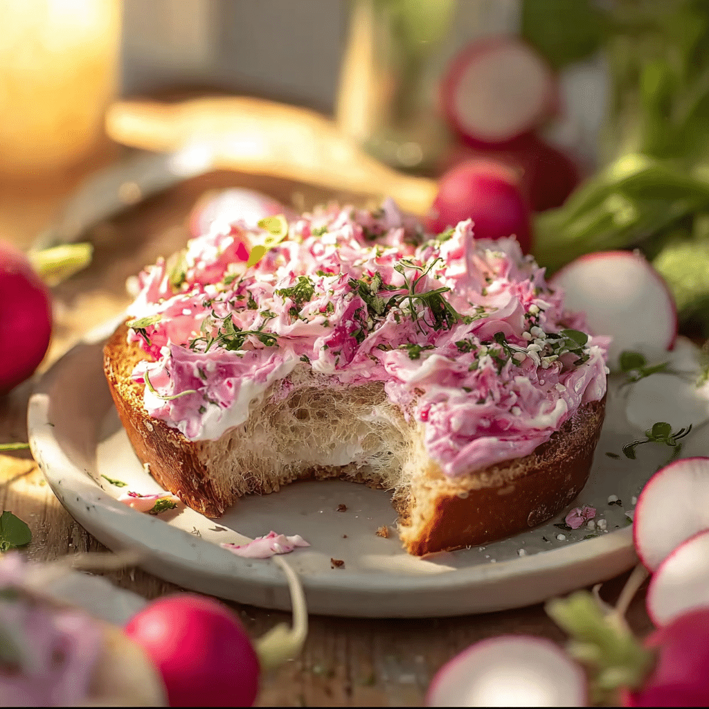 A creamy, slightly peppery spread where crisp fresh radishes meet silky butter, perfect for spreading on crusty bread or using as a bright, savory accent.