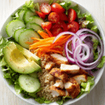 There is something so comforting about a big, colorful bowl placed right in the center of the table. A Salad Bowl like this feels fresh, generous, and full of life. Crisp greens, juicy tomatoes, creamy avocado, and tender grilled chicken all tucked together with fluffy quinoa, it is the kind of meal that makes you feel good from the first bite to the last. Trust me, you’re going to love this. It is simple, nourishing, and honestly, it looks like something you would order at your favorite café.