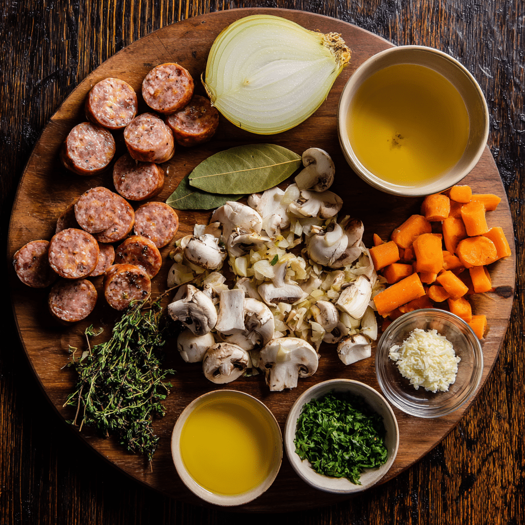 Apple Cider: Brings a touch of sweetness and fruitiness that balances the savory sausage and mushrooms.