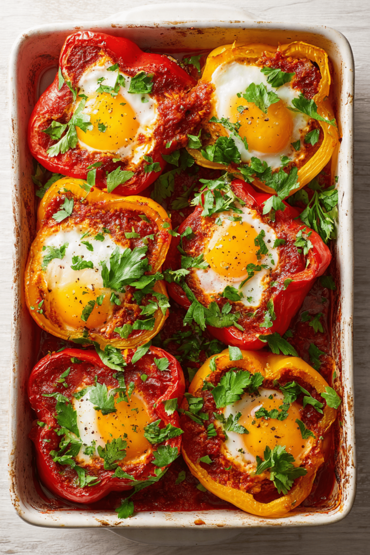 - Assemble the Dish: Spoon the tomato mixture into each pepper half. Make a small well and crack one egg into each.