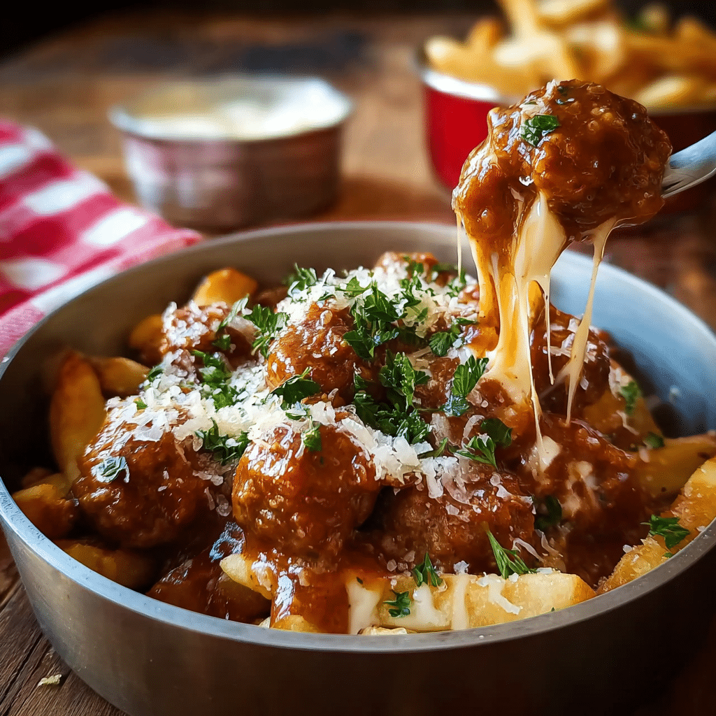 A cozy, slow-cooked twist on classic Canadian poutine, featuring savory homemade meatballs simmered in a rich beef gravy, ladled over crisp fries and topped with squeaky cheese curds. Comfort food that’s worth every bite.