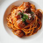 Classic spaghetti tossed in a rich tomato sauce and topped with tender, juicy homemade meatballs. A comforting and satisfying meal that brings traditional Italian American flavors to your table.