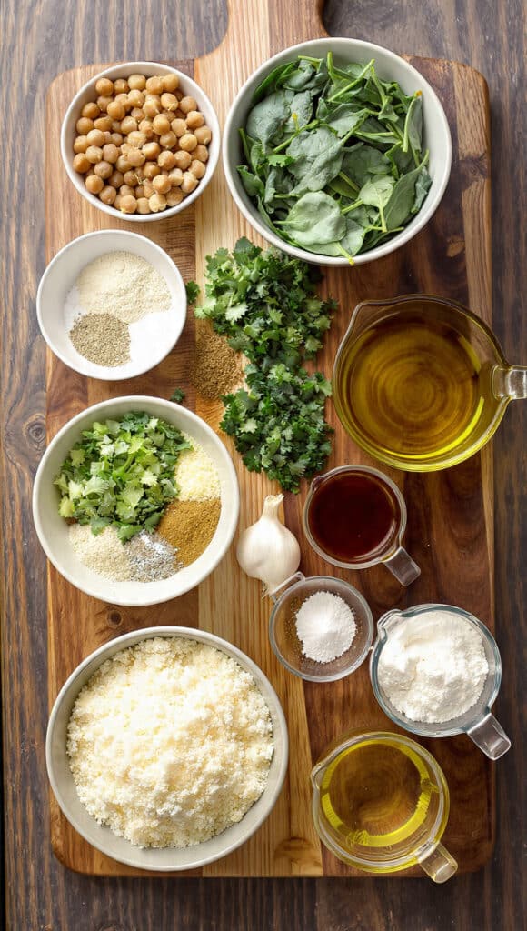 - Combine Ingredients: In a food processor, add soaked chickpeas, spinach, half of the parsley, garlic, cumin, coriander, salt, and black pepper. Pulse until finely chopped but not smooth. Transfer to a bowl and mix in baking powder and flour.