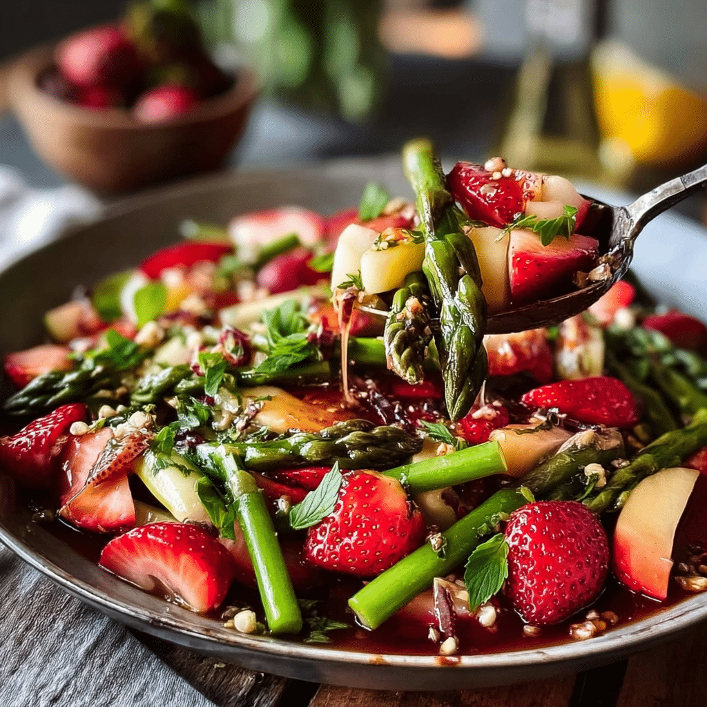 This salad was born from the simple joy of seasonal produce. When strawberries, asparagus, and rhubarb arrive together at the market, it feels like nature’s way of inviting us to celebrate warmer days. I first tried this combination at a small countryside café, and it was so memorable that I recreated it at home. Ever since, it has been my go-to when I want something that tastes bright, cheerful, and just a little unexpected.