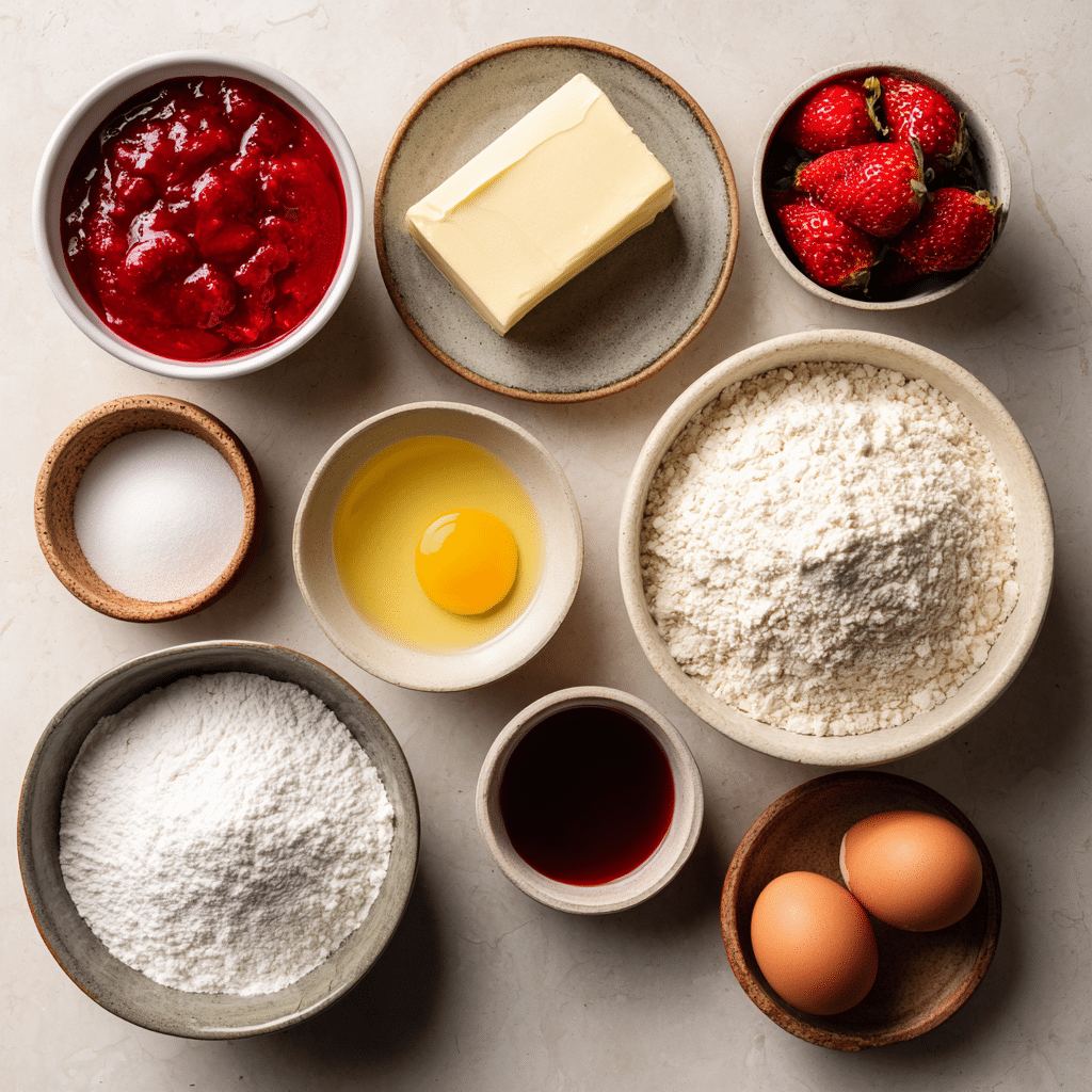 - Fresh Strawberries: ½ cup, pureed for the natural pink glaze.