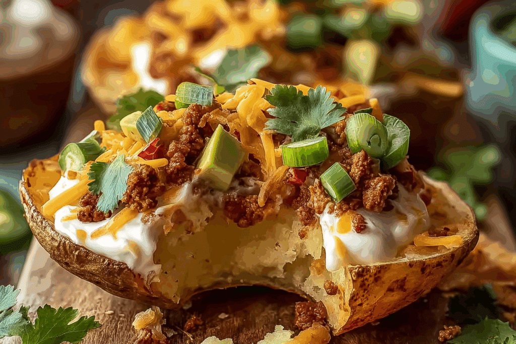 Each bite is a dance of textures — crispy skin, fluffy potato, juicy taco filling, melty cheese, and cool creamy toppings. The spice from the taco seasoning balances perfectly with the soothing creaminess of sour cream, creating that signature comfort bite.