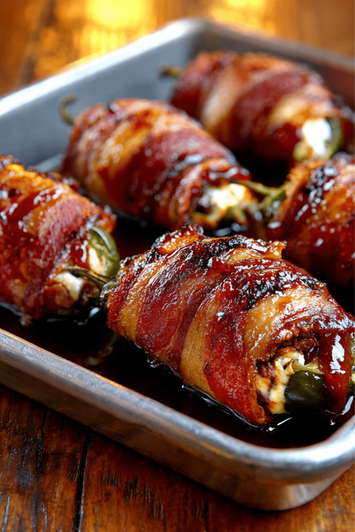 Smoky jalapeños stuffed with brisket and cream cheese, wrapped in crispy bacon, and glazed with sweet BBQ sauce — the ultimate Texas BBQ appetizer.