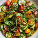 Bright, crisp, and incredibly refreshing, this Tomato and Cucumber Salad with Fish Sauce Vinaigrette brings bold Southeast Asian flavors to a summer staple. Juicy cherry tomatoes meet cool cucumber slices in a tangy, umami-packed vinaigrette that dances on the tongue. Fresh herbs lift every bite, making it the kind of dish you’ll want to keep on repeat when the weather’s warm and the produce is at its best.