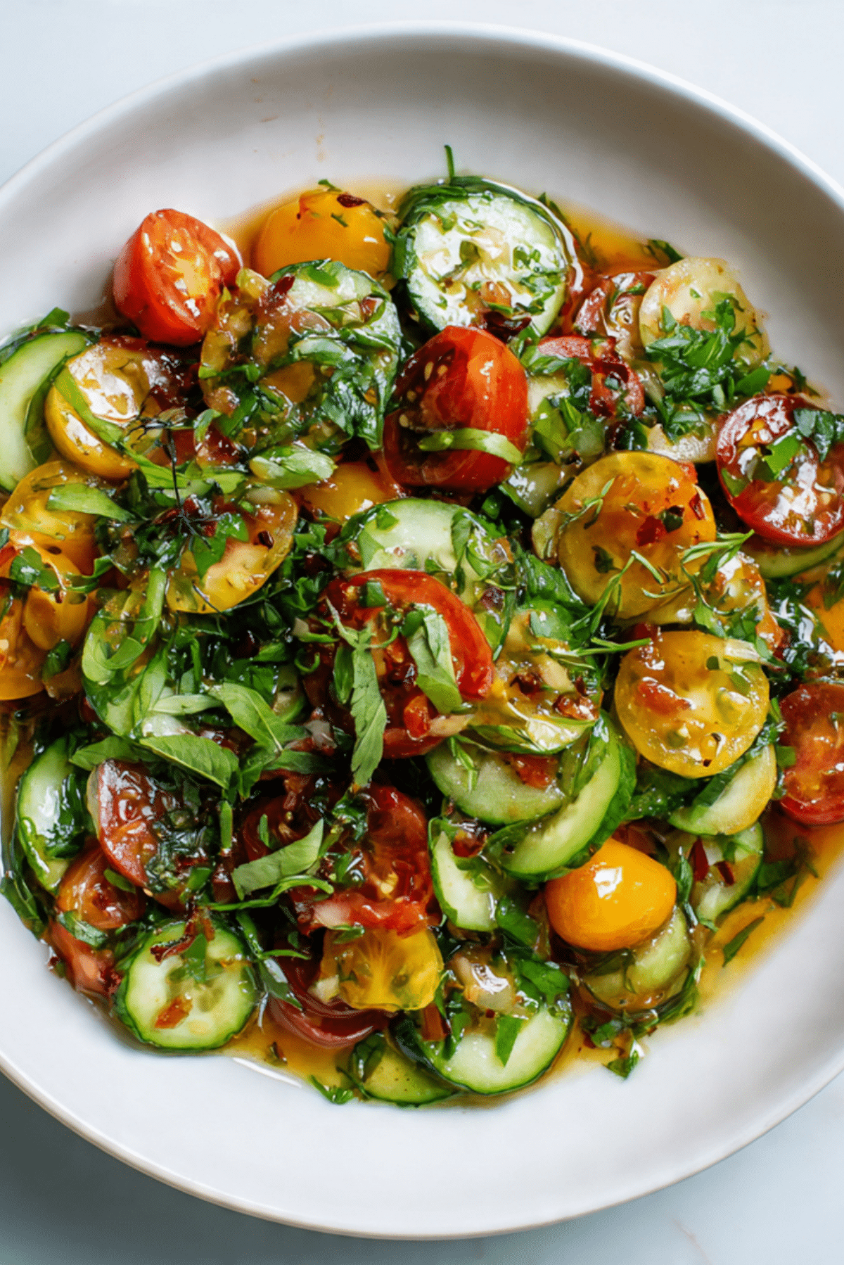 This salad is all about contrasts. The juicy pop of tomatoes. The cool snap of cucumber. The soft, herbal kiss of mint and cilantro. And don’t forget that vinaigrette—tangy, salty, sweet, and just a little spicy. Every bite is a perfect little storm of flavor and texture.