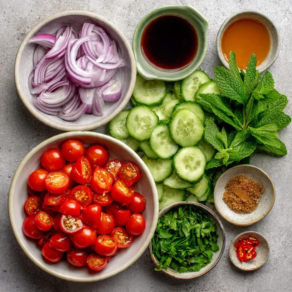 Ingredients in Tomato and Cucumber Salad with Fish Sauce Vinaigrette