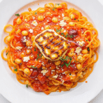 There are nights when you want something comforting but still bold, something that feels cozy yet exciting. This is exactly that kind of pasta. It starts with a rich tomato base, warms up with harissa, gets hearty from chickpeas, and then finishes with feta that is lightly charred and kissed with hot honey. Trust me, you’re going to love this from the very first forkful.