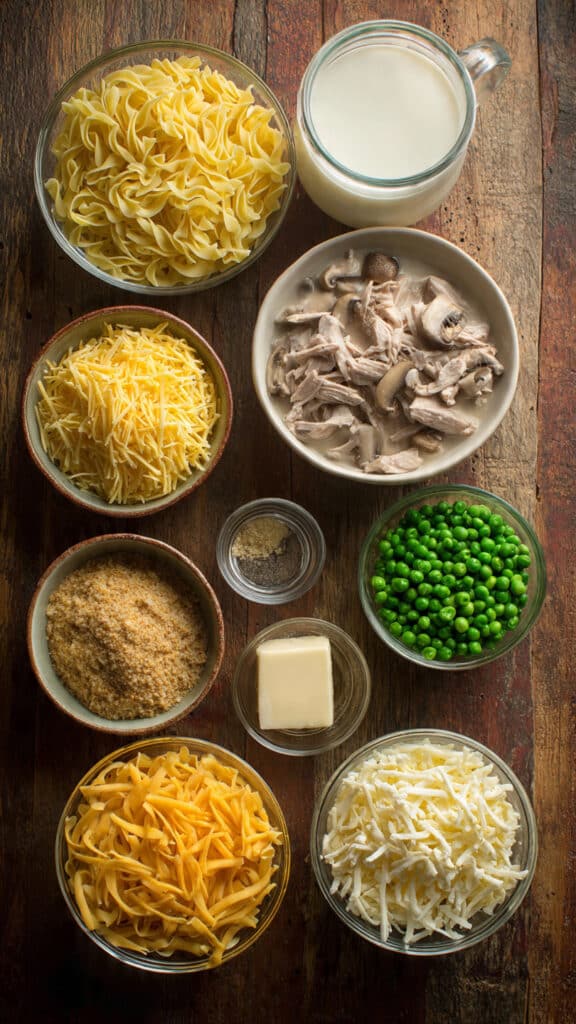 - Combine Ingredients: In a large bowl, mix the cream of mushroom soup, milk, salt, and black pepper until smooth. Stir in the drained tuna, green peas, and shredded cheese.