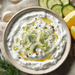 The creamy richness of Greek yogurt meets the crisp bite of cucumber and the sharp, punchy hit of garlic. Fresh dill adds an aromatic brightness, while lemon juice brings a vibrant tang. The final result is cool, zesty, and balanced with just the right contrast between smooth and crunchy.