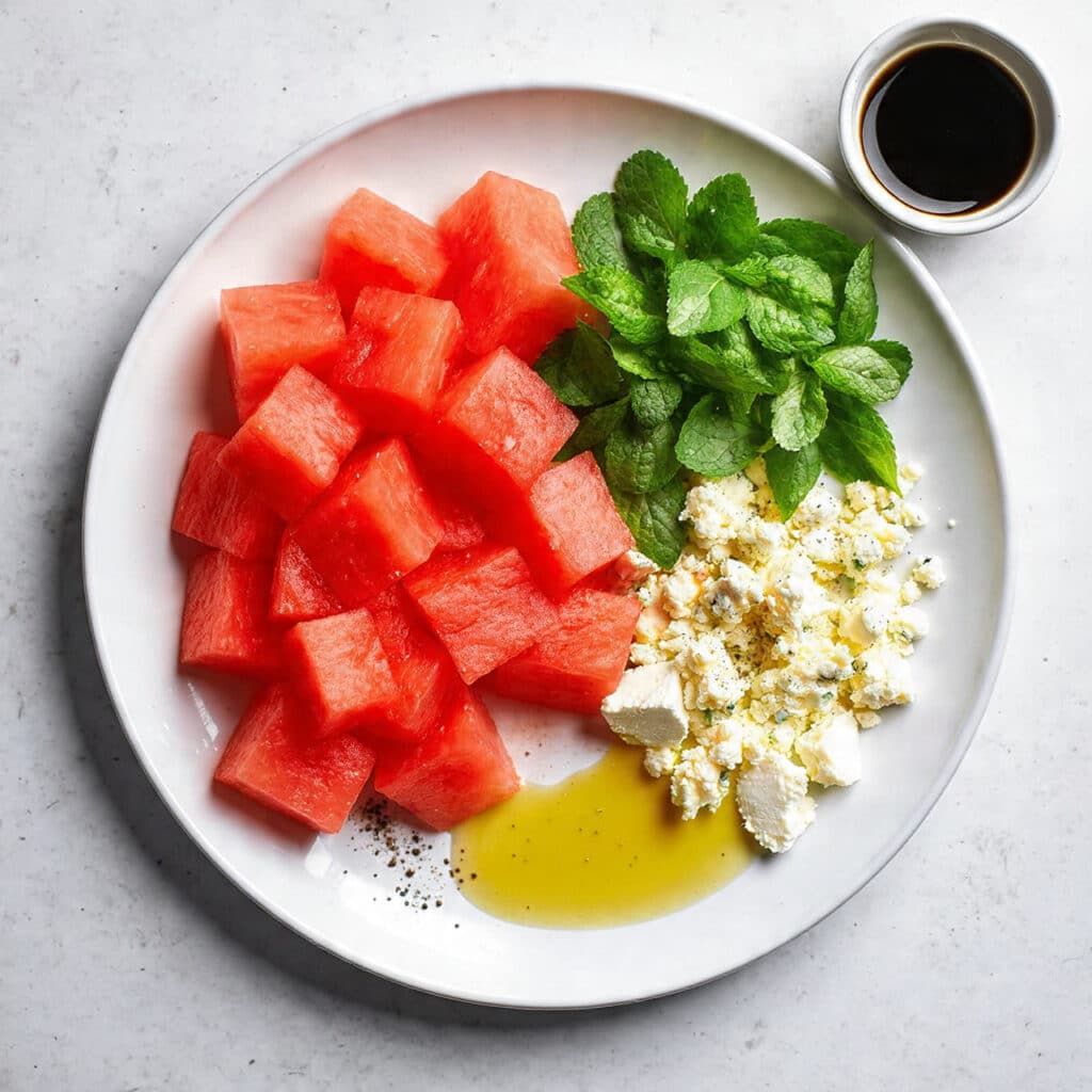 Feta Cheese: Tangy and salty, feta brings balance and richness. Its crumbly texture contrasts beautifully with watermelon’s juicy bite.