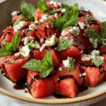 This salad was born on a hot afternoon when I needed something cold, light, and flavorful. I had watermelon chilling in the fridge, some leftover feta from a pasta night, and mint growing wild in the garden. Tossed together with a quick splash of balsamic glaze, it turned into one of those dishes you make once and then make again every week. It’s simple, beautiful, and surprisingly addictive.