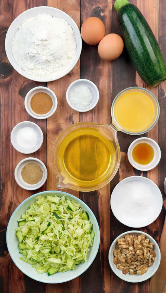 - In another bowl, beat eggs. Stir in oil, sugars, and vanilla. Mix in the grated zucchini.